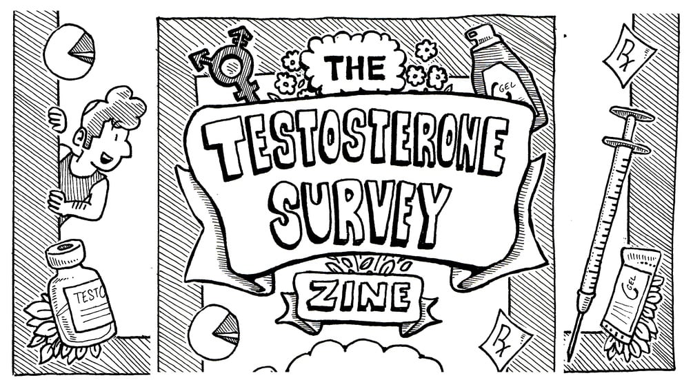 The Testosterone Survey Zine is a 60-page community health art project compiling the results of a nearly-400 person survey documenting the experiences of people medically transitioning on testosterone. The only resource of its kind, this zine features analysis and trans-joy illustrations by Rena Yehuda Newman, illuminating the qualitative data of hundreds of transmasculine people.